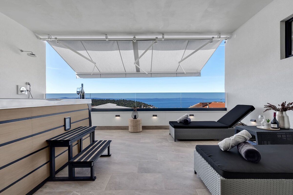 El apartamento se completó en 2022. El apartamento tiene 100 m² e incluye un dormitorio de lujo con una cama con somier de 200 x 200 cm y baño privado, cocina totalmente equipada, gran salón y aseo adicional. El gran balcón cubierto ofrece magníficas vistas al puerto y al casco antiguo, así como un hermoso jacuzzi de 220 x 220 cm, tumbonas y una ducha. Hay aparcamiento cubierto delante del edificio. La distancia al puerto es de 500 metros y a 800 metros de la playa principal. Esperamos poder hospedarte pronto. Tina y Robert