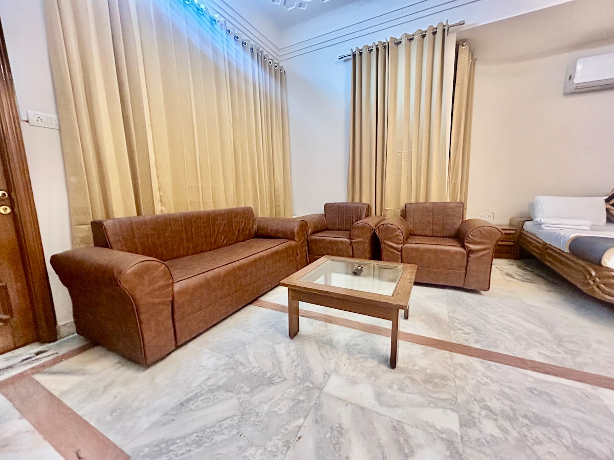 Relax with the whole family at this peaceful place to stay. The impressive Garden View welcomes you to a 3,500+ square-foot layout. Once inside, the huge SONY 4k TV in the hall makes it perfect for Movies. Three AC bedrooms, 1 Non AC Bedroom, and 1 AC in Living area, with a Surprised spacious sit-out area and Puja room.