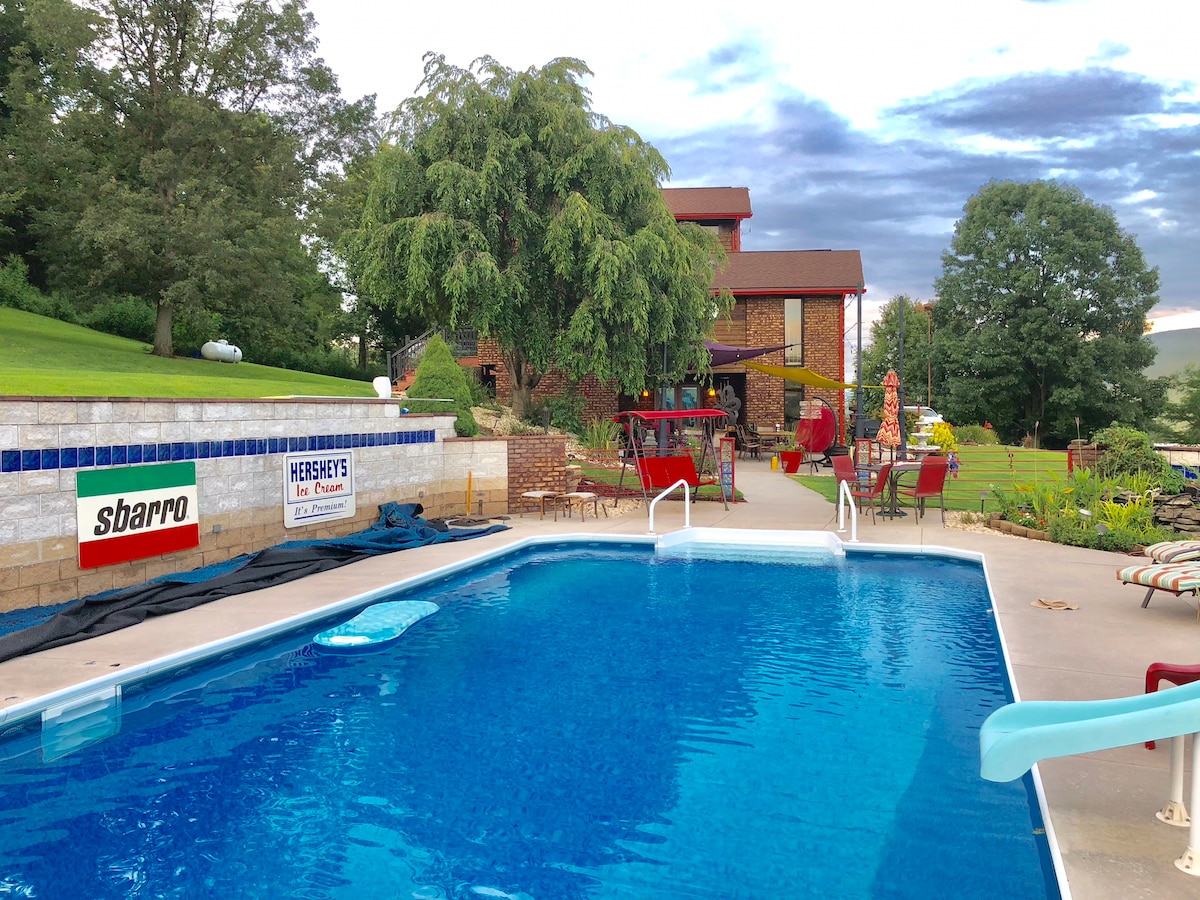 Lovely, private home overlooking our beautiful valley with breathtaking views of Wills Mountain. It is the perfect setting for a family retreat/reunion. The ranch house has a red roof in the pictures. My husband & I live in the 3 story. We have a in-ground pool on property (heated from Mid-May to early September), a gas grill, and fire pit on the large scenic patio for your enjoyment. The large windows & patio offer a spectacular view of Wills Mt. The ranch house offers a quiet getaway retreat.