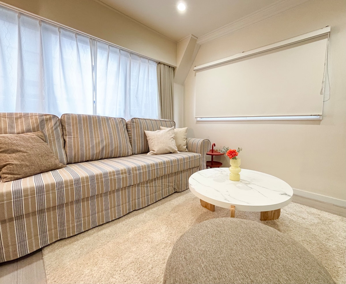 A solo 2 minutos a pie de la estación, Palette House es un refugio acogedor y elegante perfecto para explorar Tokio. La cocina de estilo industrial incluye una barra en la isla, utensilios de cocina completos, copas de vino y un dispensador de agua, ideal para cocinar y tomar bebidas por la noche. El salón está decorado con madera flotante natural y un cómodo sofá, mientras que el dormitorio de estilo japonés moderno ofrece un espacio refinado y relajante. Con comodidades bien pensadas y un diseño cálido, es una base perfecta para parejas y familias.