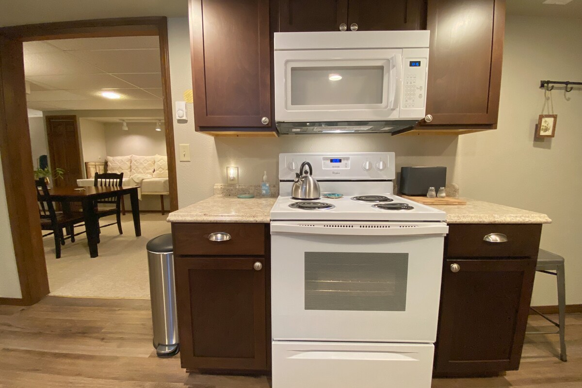 ¡Todas las comodidades en una suite familiar de 1 dormitorio y 1 baño! Entrada independiente de la casa principal y tu propia plaza de aparcamiento en la entrada. Situado en una calle sin salida tranquila, pero a poca distancia a pie de parques. A 5 minutos en coche del centro de la ciudad. Cocina pequeña, mesa grande, sofá cómodo, escritorios para estaciones de trabajo, así como internet rápido de 200 mb, hacen de este el lugar perfecto para lo que sea que tu viaje pueda contener.