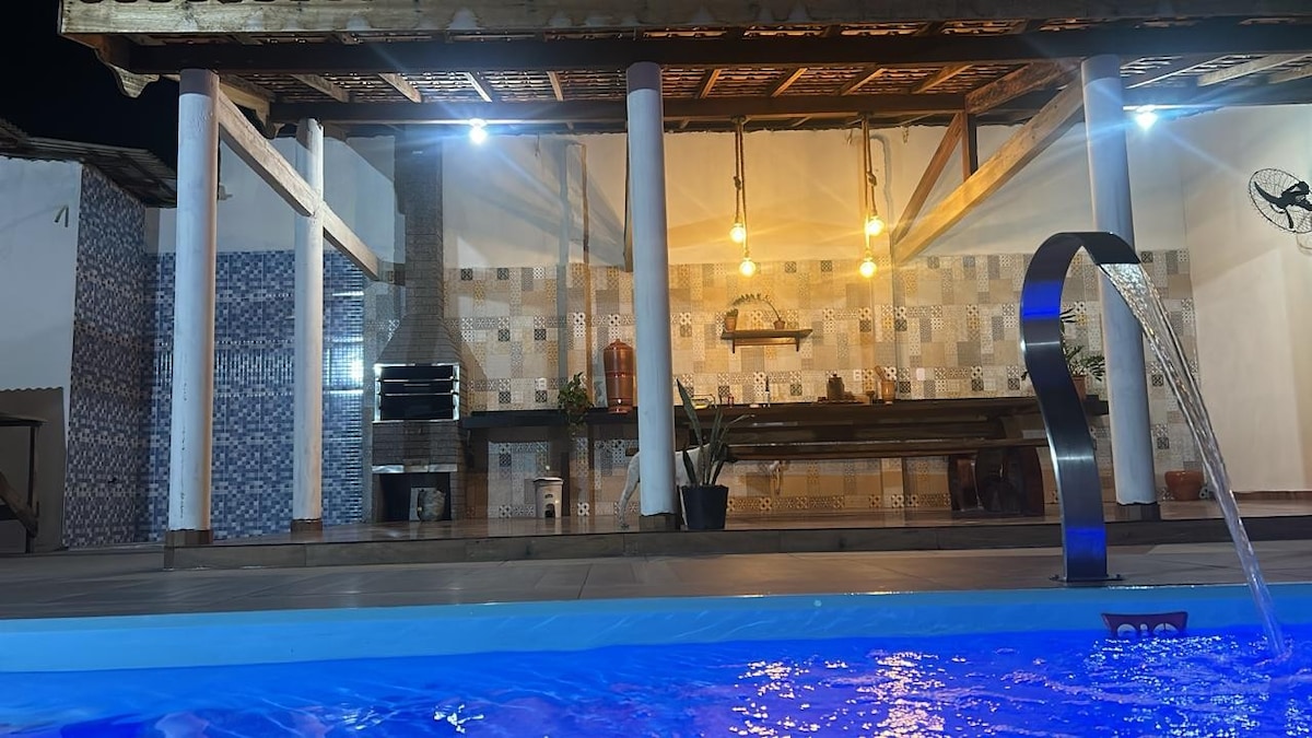 Experiência relaxante com toda a família nesta acomodação super agradável Suite: 1 cama de casal e uma de solteiro, com split e banheiro. Quarto 1: 1 cama de casal e 1 cama auxiliar de solteiro, com split Quarto 2: 1 cama de casal e 1 cama de solteiro, com ar-condicionado Armadores de rede nos quartos, varanda e sala 4 ventiladores Poço artesiano, água filtrada. Internet wi-fi TV na sala com Netflix, prime vídeo, Max, Disney e Mub. Piscina, churrasqueira e área verde. Portão elétrico.