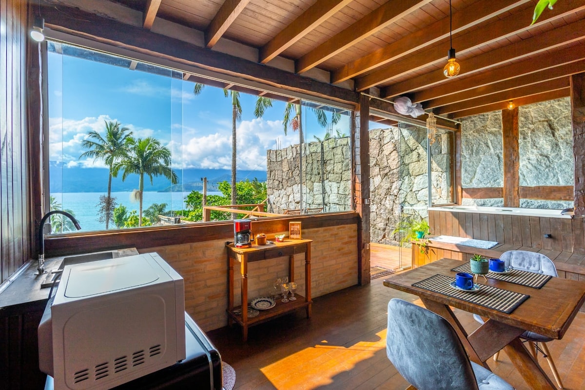 Mirante da Jana Ilhabela Alojamiento único ideal para aquellos que aman la naturaleza, buscan privacidad, tranquilidad y comodidad. Los detalles hacen que el lugar sea extremadamente acogedor y acogedor, proporcionando una estancia muy cómoda. Solo hay 6 unidades, en dos parcelas: Lado mar: DOS CHALETS frente a la piscina, con vistas al mar y con bañera de hidromasaje. Lado de la montaña: condominio con CUATRO CASAS con jacuzzi (este anuncio) no tienen vistas al mar, ¡acceso a la piscina con una vista increíble!
