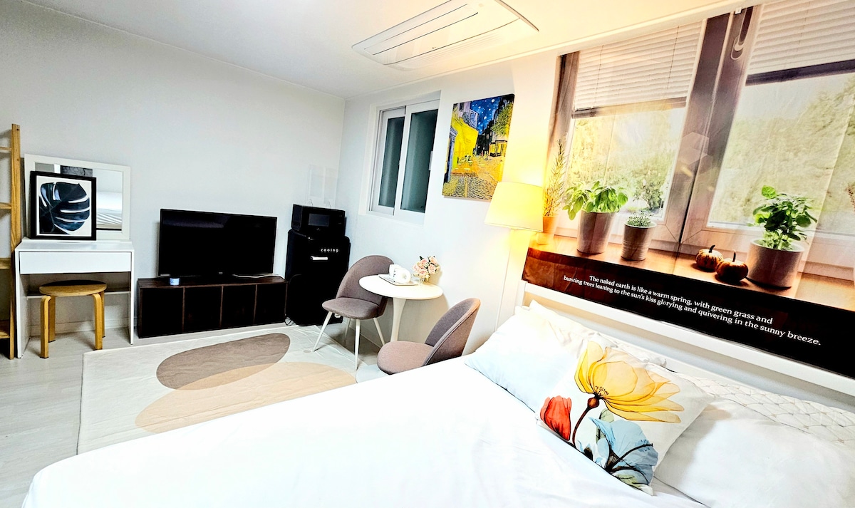 안녕하세요! 신규 오픈 했습니다 무엇보다 청결에 신경 쓰겠습니다 침구류 매일매일 세탁-건조-소독 하여 교체합니다 믿고 안심하셔도 돼요😊 카페와 호텔에 온 것처럼 편안하고 고급스러운 분위기를 강조하고자 쾌적한 침구류, 인테리어에 집중하였습니다 거실 공간은 실제로 좁지 않습니다❗️ 🤍대형 100인치 스크린 빔프로젝터 Ott 이용가능 🤍 🤍생수 500ml x 2 제공 📍넷플릭스 유튜브 프리미엄 제공 저의 숙소에서 편안한 잠자리와 CD 음악을 들으며 커피 한 잔의 여유, 선명한 빔프로젝터(번거롭게 게스트님이 설치X)로 대형 홈씨네마를 즐기시고 이쁜 추억 쌓으셨으면 좋겠습니다. 여유롭게 늦잠을 주무셔도 좋습니다! 퇴실시간은 오후1시입니다. 주차 무료!! 자비를 부담하여 주차 걱정 해결해 드리겠습니다 ❗️저의 프로필을 눌러보시면 다른숙소도 준비되어 있습니다 모두 호스트 본인이 정성을 다해 최대한 신경 쓰며 운영합니다 놀러오세요🩵
