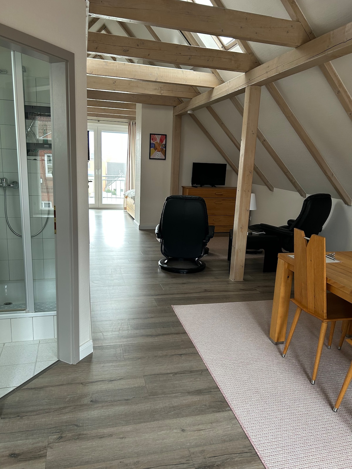En la casa protegida como monumento histórico, justo en el centro de la ciudad de Theodor Storm, se encuentra el luminoso y espacioso ático «Bajo las estrellas». Aquí viviréis muy cerca de las estrellas del norte de Frisia en una sala de estar/dormitorio con cama doble, sofá, sillón, escritorio y TV, cocina con mesa de comedor. Abajo, en el patio interior, podéis quedaros a disfrutar de una barbacoa y relajaros cuando el tiempo no acompaña. Las visitas turísticas, los restaurantes, las cafeterías y las compras en las inmediaciones harán que esta base de vacaciones sea aún más agradable.