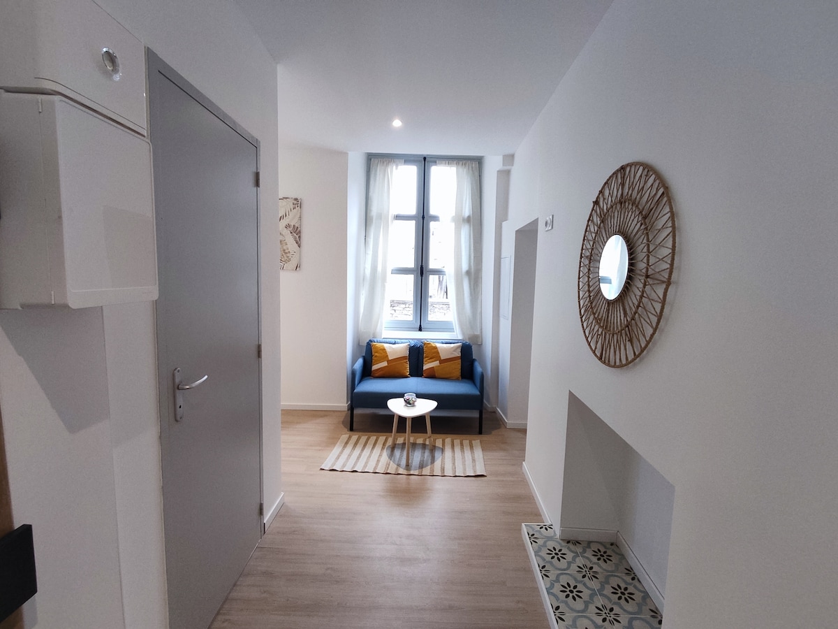 Bonito dúplex de 27 m² totalmente renovado que combina lo moderno y lo antiguo. Cuenta con una sala de estar, comedor y cocina equipada, un baño con ducha, un dormitorio arriba y una terraza (puede que se encuentre con Suzie, nuestra adorable perra). Encontrará parquet antiguo y azulejos de época. El apartamento es adyacente a nuestra casa. Situado en el centro de la ciudad, en el barrio de Colbert, a 2 minutos a pie del centro. Aparcamiento gratuito a 1 minuto andando.