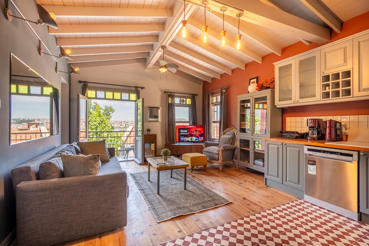 Ático grande, luminoso y moderno de 35 metros cuadrados con una hermosa vista al Bósforo. 1 cama tamaño queen, cama amigable con la columna vertebral, cocina completa y sábanas de lujo. TV de 32 pulgadas con satélite y wifi gratuito. Muy cerca de la estación de metro y de los ingresos de Istiklal.