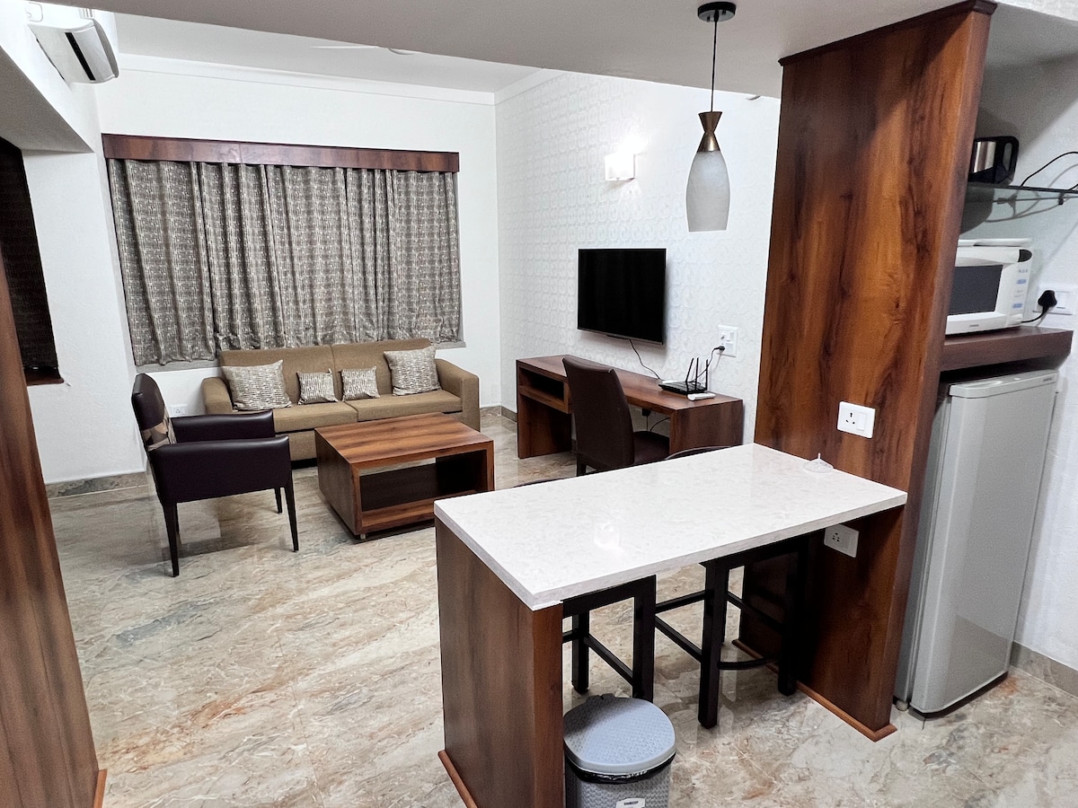 Welcome to our modern 3BHK retreat, perfect for families, friends, or business travelers. Each bedroom is air-conditioned for comfort, while the living area offers a 55” Smart TV, soundbar, and a PS5 with plenty of games. Cook with ease in the fully equipped kitchen, enjoy the convenience of a washing machine, and stay stress-free with reliable power backup. Step out onto the to relax at the private terrace patio — a perfect spot for morning coffee or stargazing at night.