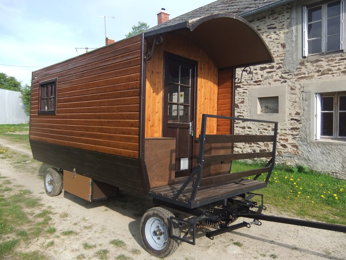 ¡Pase una o más noches en una pequeña caravana generalmente tirada por caballos! Cama doble y 2 camas para niños. En el exterior de la caravana encontrará una zona de cocina, un baño y un inodoro seco. Parking gratuito. Posibilidad de alojar más personas añadiendo una o varias tiendas de campaña. Posibilidad de paseo en carruaje tirado por caballos y recepción de caballos. Nuestros amigos los perros no están permitidos.