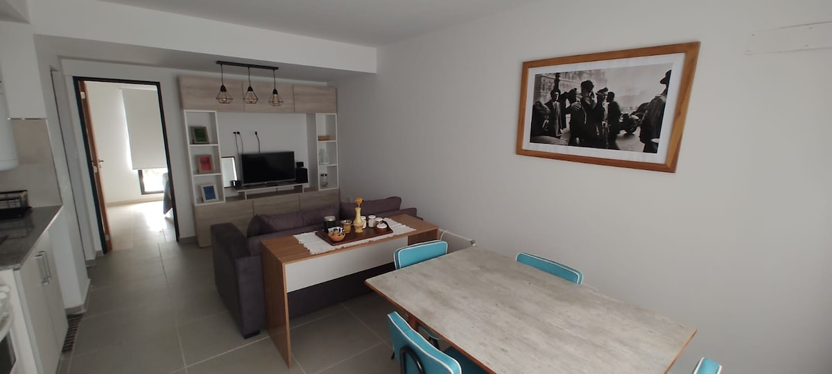 Vení a relajarte a este cómodo y tranquilo departamento, ubicado cerca del acceso a la ciudad por la Ruta 6. Cuenta con un patio interno con césped y flores muy lindo. Equipado para 4 personas, con 1 cama matrimonial y otro somier de una plaza y media con otra cama abajo; comodidad 100% garantizada. El baño tiene antebaño y baño separado para mayor comodidad. Decorado con tonos cálidos, obras de arte coloridas y acentos en madera te hará sentir cómodo y relajado durante tu estadía.