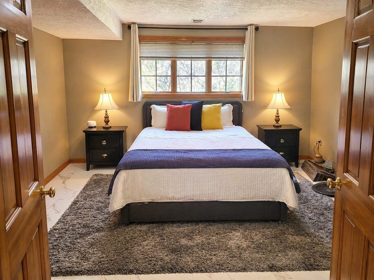 Private lower-level suite with comfortable bedroom, full bath, living area, and a well-equipped cooking area for extended stays. Guests enjoy a private entrance, in-suite laundry, and exclusive access to a relaxing outdoor hot tub. Spacious, and ideal for travel professionals or longer visits. Conveniently located near local hospitals, MSU, and shopping.