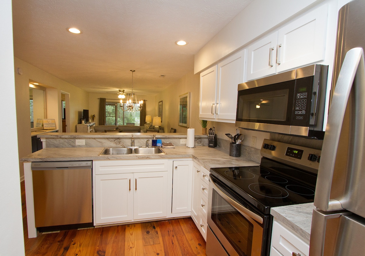 Apartamento recién renovado de 2 dormitorios y 2 baños en la planta baja en True Blue Resort. El dormitorio principal tiene una cama tamaño king, el segundo dormitorio tiene dos camas individuales. El baño del pasillo tiene una ducha a ras de suelo. Televisores en todas las habitaciones con cable digital y wifi gratuito. Cocina totalmente equipada. Porche de pantalla con asientos y piscina a pocos pasos. A 5 minutos de la playa. Se proporcionan todas las sábanas. Se admiten mascotas pequeñas con una tarifa de limpieza adicional de 50 $. No se permiten autocaravanas, remolques, barcos o motocicletas en el resort