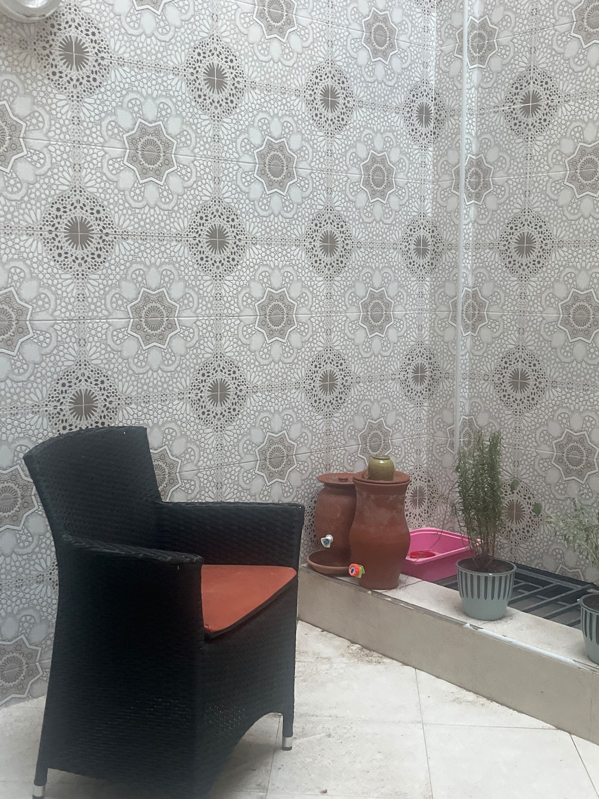 Agadir Talborjt Este magnífico Riad, en el centro de la ciudad,a 10 minutos a pie de la playa,le da la bienvenida en un estilo marroquí limpio y moderno ¡Esta propiedad,completamente renovada,ofrece un diseño de alta gama, único en Agadir! Se entra en un jardín desde donde se sube un pozo de luz hasta las 2 plantas y la terraza,en la pura tradición de los Riads marroquíes El jardín interior es un salón de descanso con televisión por cable y Netflix con sofás,sillones y pufs marroquíes. Un verdadero salón de descanso.