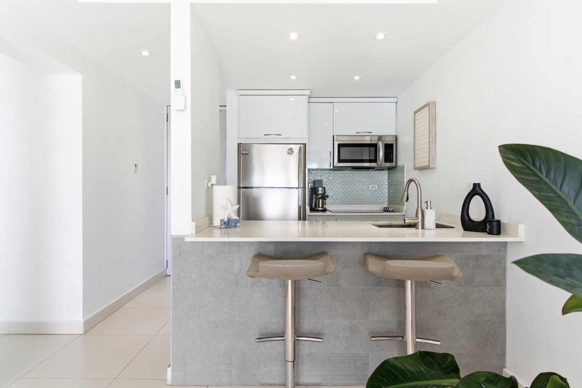 Apartamento remodelado a pocos pasos de una playa semi privada, a menos de 5 minutos del aeropuerto, a poca distancia de la bulliciosa vida nocturna y de los mejores restaurantes. Disfruta de un brunch tardío a poca distancia, luego toma el sol durante el día con todos los servicios incluidos, relájate con Netflix por la tarde y bar aro por la noche... ¡o simplemente quédate! Explora la isla con tu alquiler y luego vuelve a tu propio estacionamiento privado. ¡Todo lo que falta eres tú!