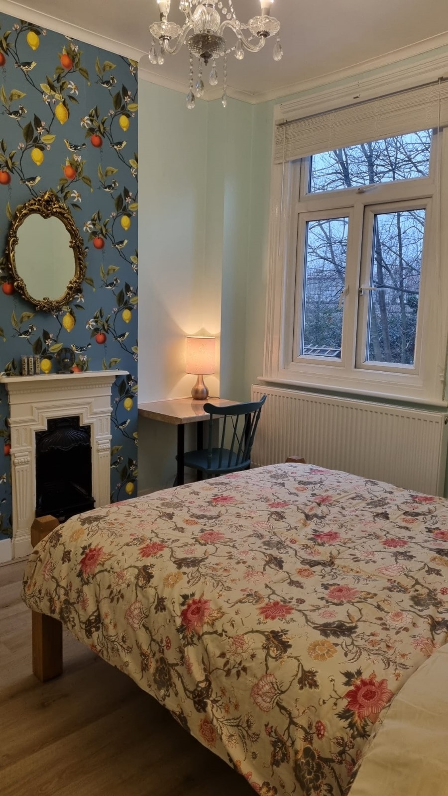 Decoración clásica con comodidad moderna en una casa georgiana bien conservada y muy bien mantenida. Cerca de la estación de tren, el viaje es de 30 minutos al centro. El dormitorio ha sido restaurado con mucho mimo y tiene un toque moderno, al tiempo que conserva todas sus características originales. Tiene dos grandes ventanas de guillotina orientadas al oeste, por lo que es increíblemente luminosa y espaciosa. Cuenta con una cama tamaño king muy cómoda y un amplio armario empotrado, escritorio y sillón. Un hermoso baño moderno (compartido) con ducha a ras de suelo está justo enfrente.