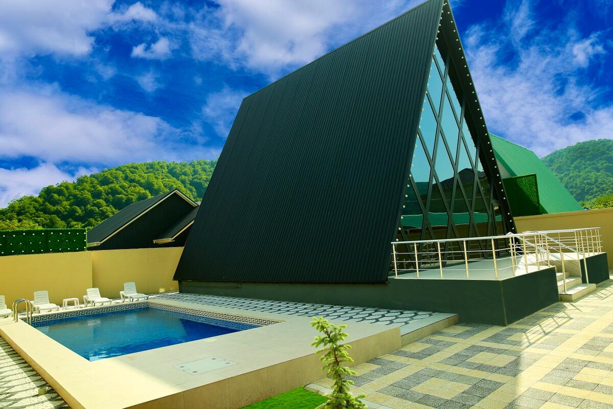 This A-frame house is located in Gabala, Azerbaijan, close to all major recreational centers and attractions such as Tufandag, Gabaland, the Seven Beauties Waterfall, and Nohur Lake. It offers all the amenities for relaxation, including a heated pool, jacuzzi, PS5, and table football