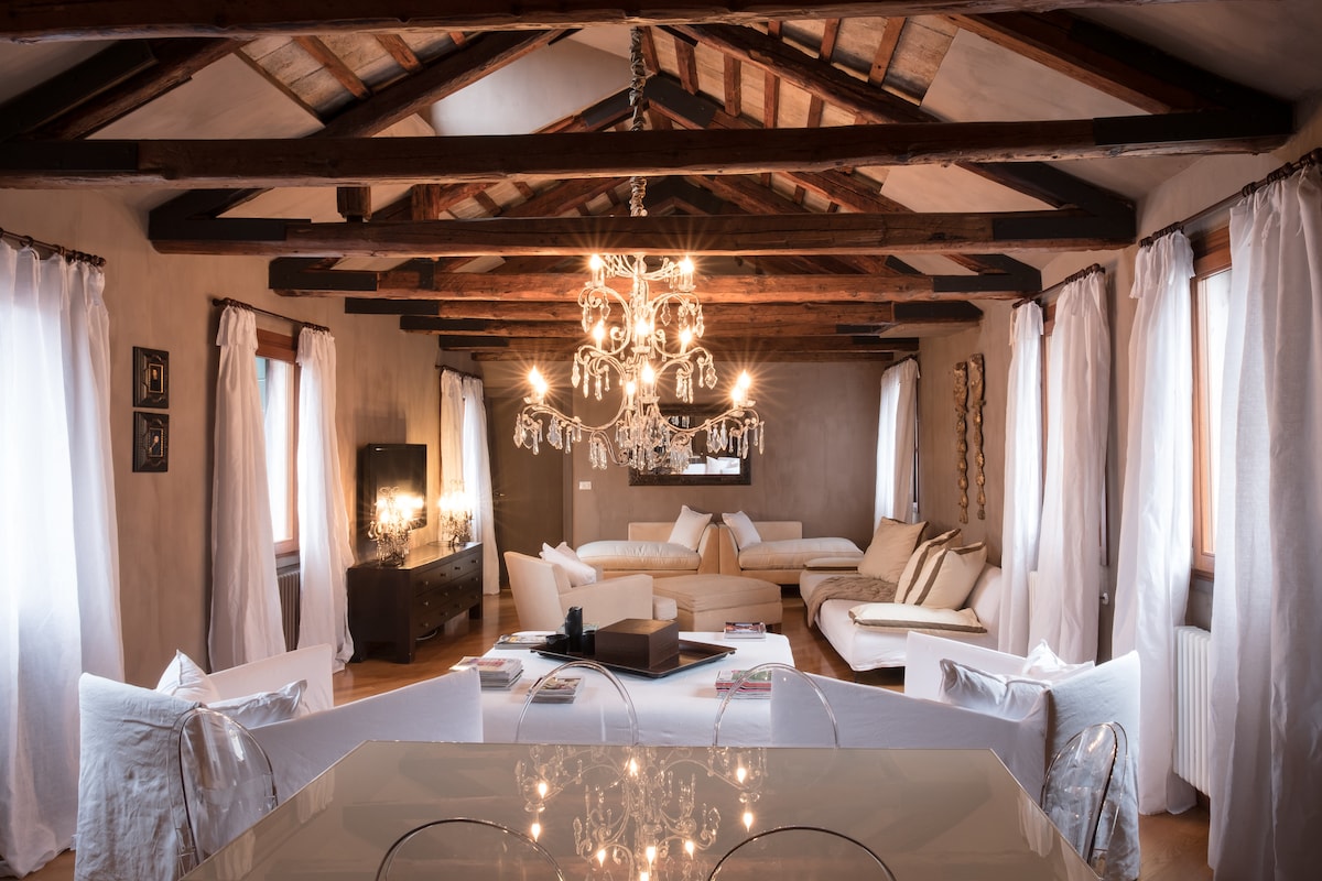 Admire la belleza de Venecia desde las ventanas arqueadas de este acogedor y espacioso apartamento que combina elementos históricos, como vigas de madera, y muebles contemporáneos. Desde los grandes ventanales se puede disfrutar de una hermosa vista del canal, atravesado por góndolas, y de los típicos edificios góticos de Dorsoduro, el barrio más auténtico de Venecia, apreciado por artistas e intelectuales de todas las épocas; encontrará libros y objetos de arte.