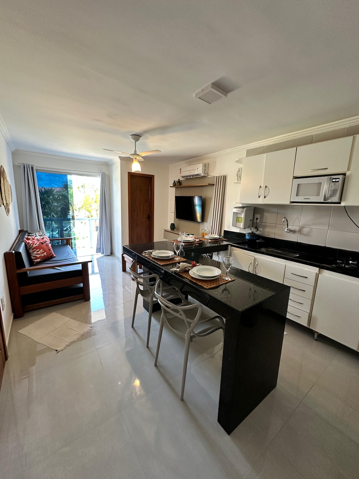 Apartamento en planta baja con 1 suite, de 50 m2, compuesto por sala de estar, cocina americana y cocina, todo amueblado y suite equipada con aire acondicionado split y ventilador de techo, TV con antena parabólica en la sala de estar y en la suite, zona de ocio con piscinas, quioscos de barbacoa, duchas, wi-fi en el apartamento y aparcamiento para 1 vehículo pequeño en las zonas del condominio. Proporcionamos ropa de cama y toallas. La limpieza de check-in y check-out está incluida sin costo adicional.