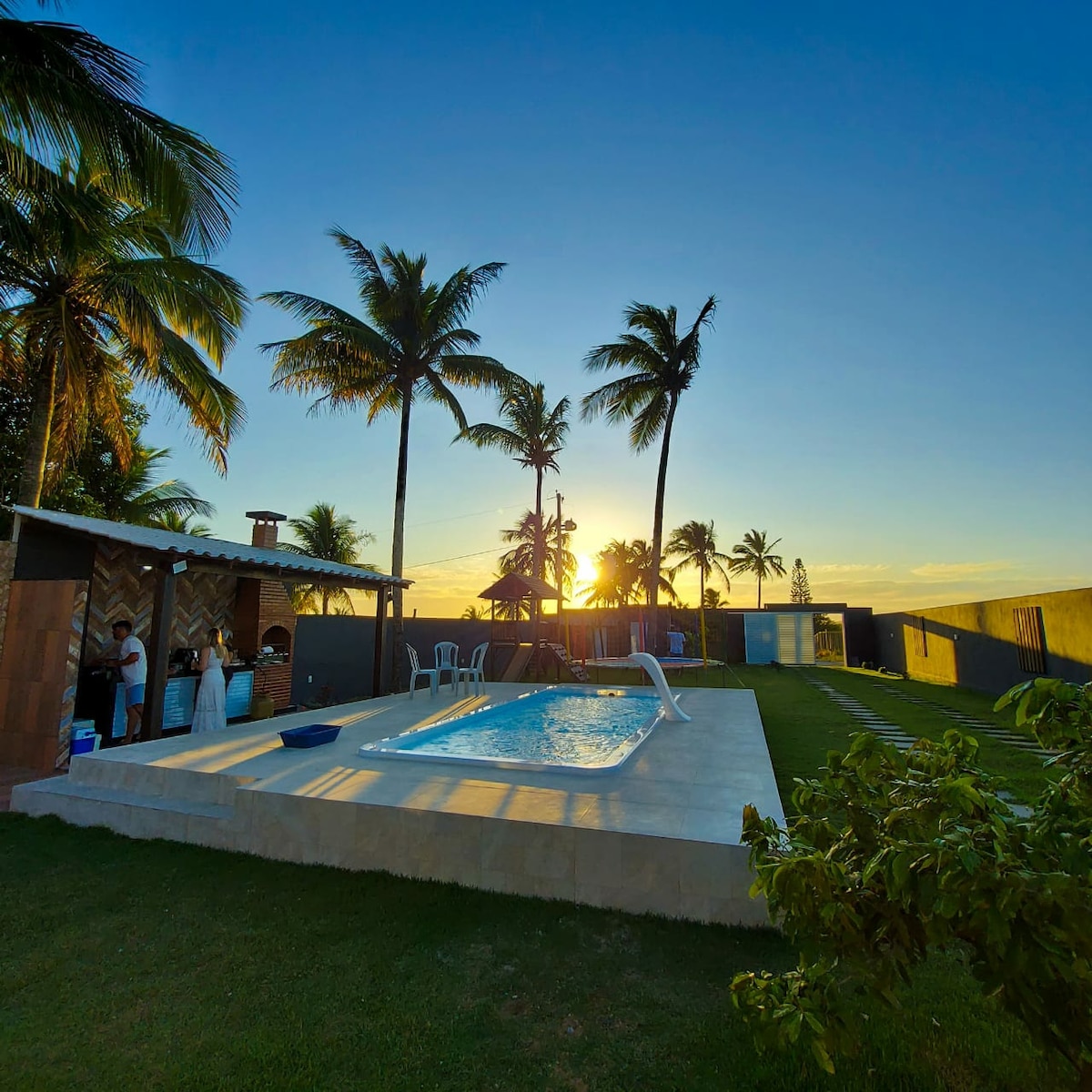 Amplio patio trasero y área de juegos para los niños, te invitamos a varias actividades al aire libre. Su encanto se debe a las tres hamacas del jardín, ideales para un descanso o una conversación entre amigos. La tranquilidad de una casa de campo y al mismo tiempo cerca de varias playas. Gran piscina para refrescarse y esa barbacoa que no te puedes perder para una buena barbacoa. Una casa grande, con 3 dormitorios, 2 baños en suite, Internet, utensilios y muebles completos para proporcionar más comodidad a los huéspedes.