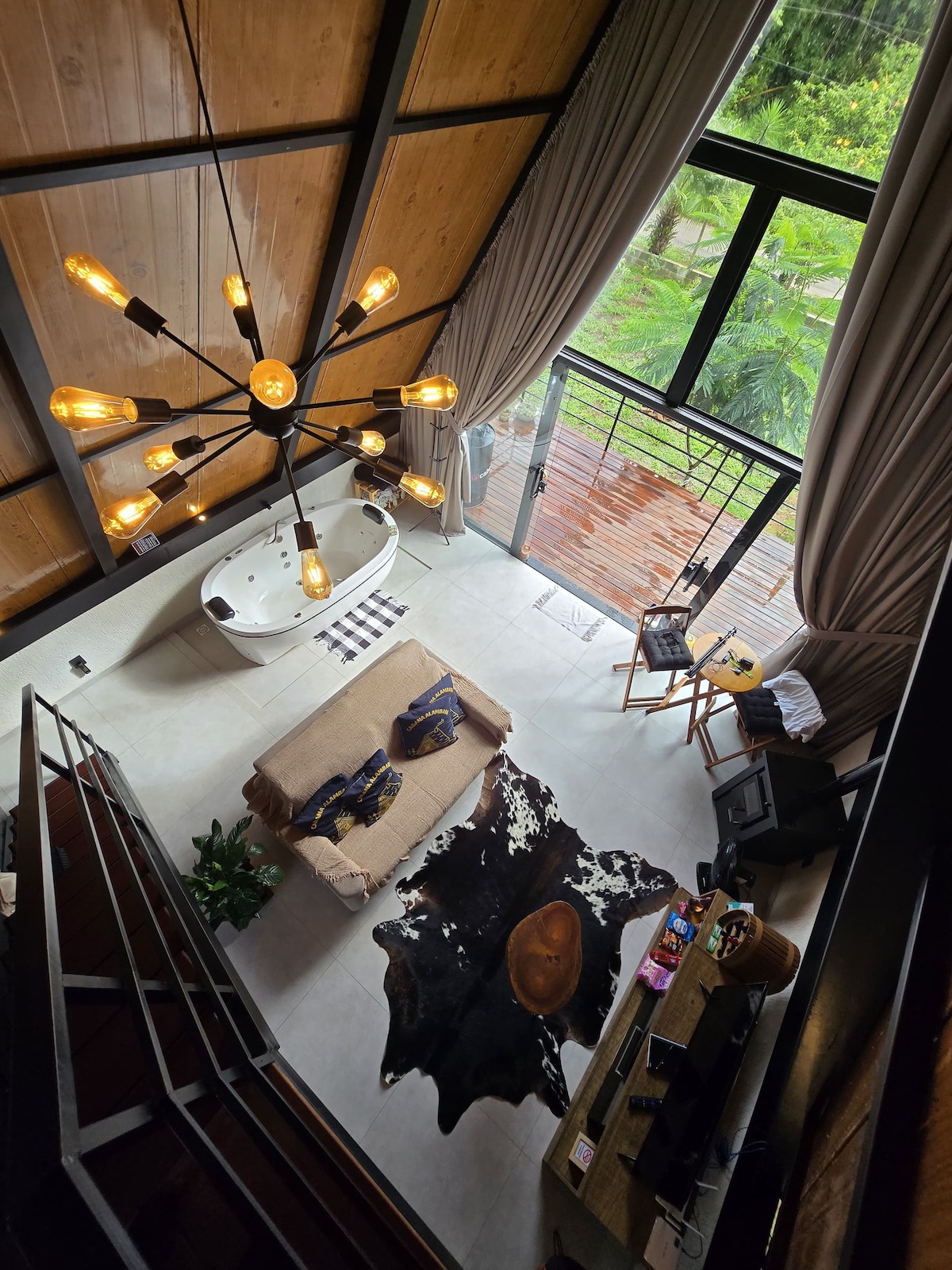 Relájate en una cabaña moderna, elegante y de alta tecnología rodeada de hermosas vistas y exuberante naturaleza. La cabaña tiene aire acondicionado, Alexa, una cama tamaño queen, TV inteligente, Wi-Fi, una cocina completa, una bañera de inmersión para uso individual a la vez, un baño completo, una chimenea, un balcón con muebles y una hermosa vista. Todo lo que necesitas para una experiencia completa. La cabaña es un sueño para las parejas que disfrutan de un alojamiento de calidad, un ambiente reservado y contacto con la naturaleza.