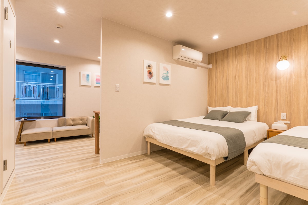 La amplia habitación de 25,28 ㎡ tiene 1 cama doble y 1 sofá cama y tiene capacidad para 3 personas. Minn es un hotel de apartamentos donde todos pueden alojarse en una habitación espaciosa.Es un espacio donde puedes vivir como una cocina y electrodomésticos, perfecto para una familia o hasta tres amigos. La zona de Nakazakicho, a pocos pasos de Umeda, es una zona donde coexisten calles retro y cafeterías y tiendas modernas, y muchos lugares fotogénicos son ideales para caminar. < Punto recomendado > Distribución donde puedes vivir en una habitación ■ espaciosa con cocina y electrodomésticos A poca distancia a pie de ■ Umeda · A 5 minutos a pie de la calle comercial Tenjinbashisuji más larga de Japón A 4 minutos a pie de una■ tienda de comestibles < Recomendado para ti > Para familias con ■ niños Si quieres probar la zona local de ■ Osaka Si estás visitando lugares de interés en ■ Osaka y Umeda