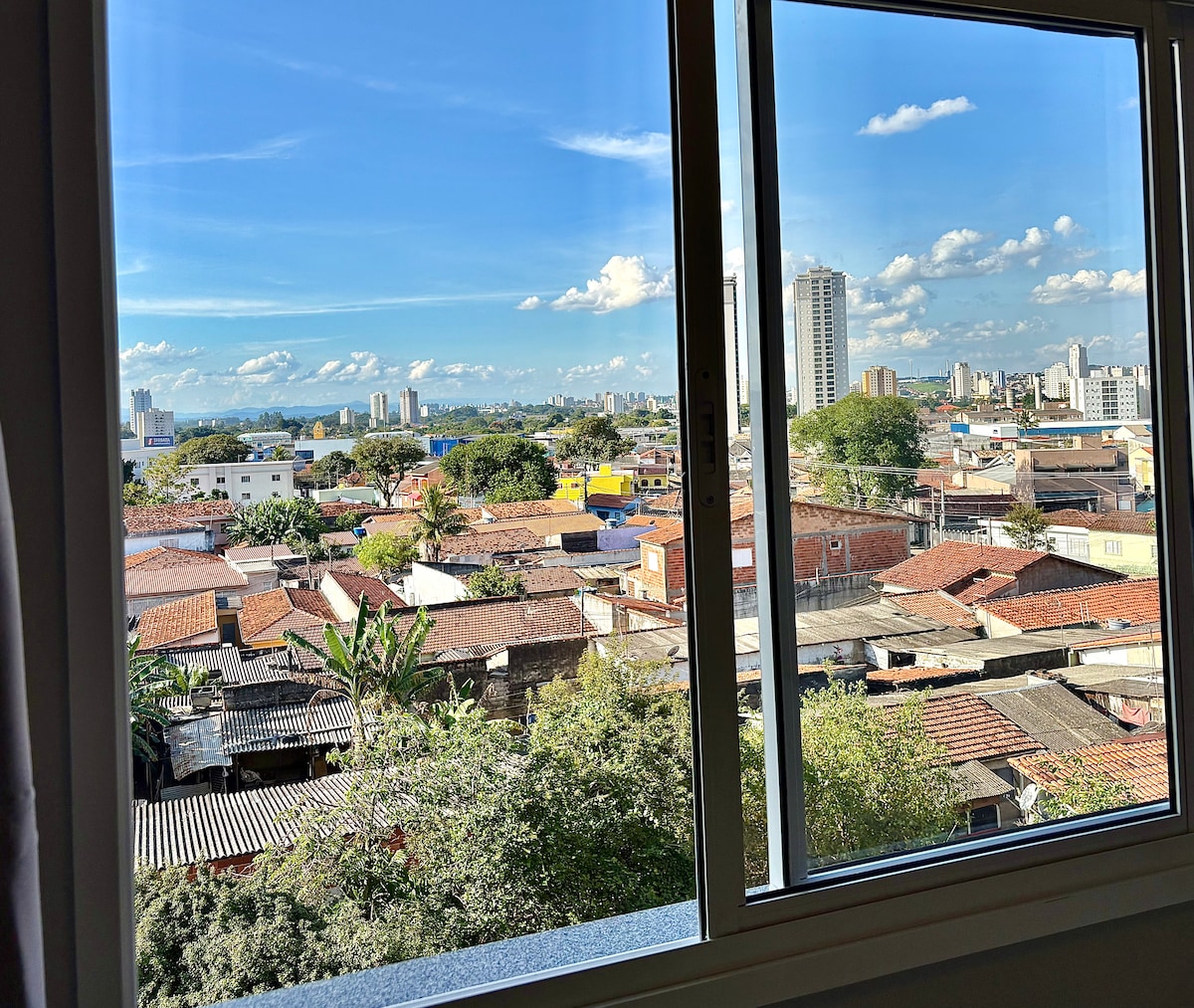 Apartamento studio 32m2, aconchegante e completo. Cama queen, A/C , WIFI 230 MB, aquecedor a gás, smart TV com Chormecast, cozinha completa utensílios, cafeteira elétrica, sala com sofá e mesa de trabalho, berço portatil. Vista livre para praça e central Jd.Colinas. Estacionamento coberto, piscina, lavanderia social, academia, espaço Home Office com WIFI e portaria 24 Horas. Possui fechadura eletrônica e 1 vaga de garagem coberta. O prédio possui mini mercado no andar térreo com diversos itens.