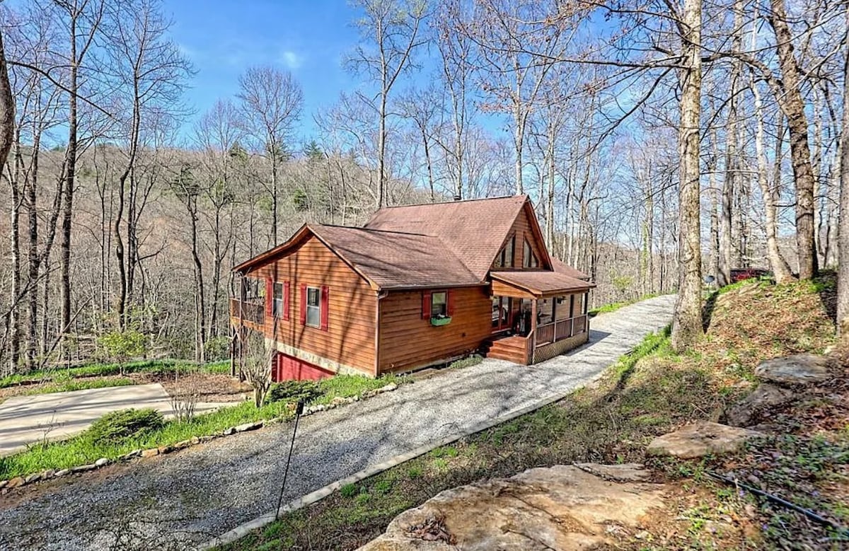 Una cabaña recién renovada que está a pocos minutos de Franklin y es fácil de llegar. ¡Lo más destacado aquí es la hermosa vista a la montaña durante todo el año! Cena en la terraza cubierta, acércate a la chimenea o simplemente relájate en la sala de estar mientras contemplas el impresionante paisaje. La cabaña está limpia y ordenada con una decoración divertida y fresca. Calefacción central/aire acondicionado, chimenea de gas, cocina de gas, parrilla de gas, terraza cubierta, TV con YouTube, juego de tejo y chimenea al aire libre son algunos de los servicios.