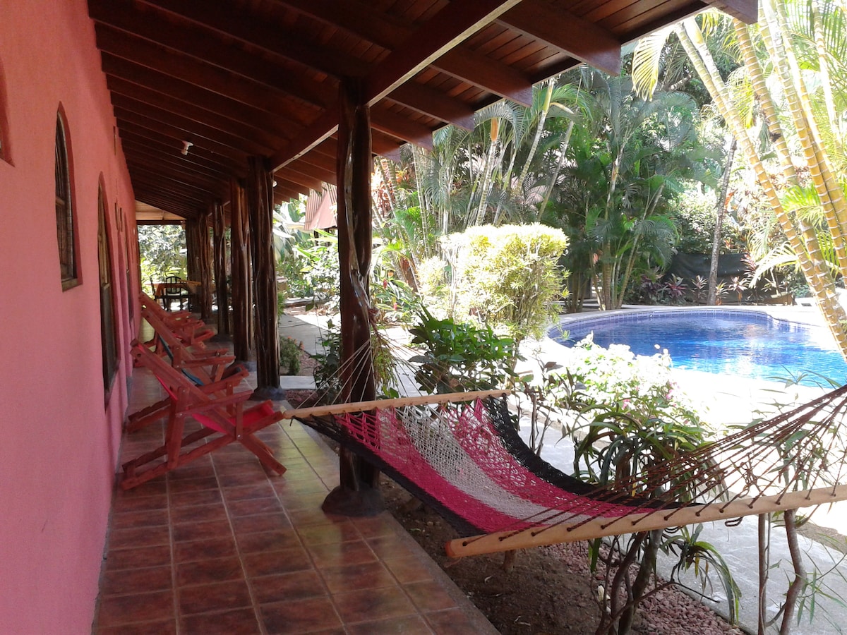 Somos un pequeño hotel de 6 unidades con un ambiente muy tranquilo en la hermosa y tranquila zona sur de Jaco. Relájate en la renovada piscina, toma tu tabla de surf o bicicleta y da un paseo justo enfrente de la puerta. Haz amigos mientras cocinas en la cocina compartida o lee un libro debajo de la pérgola.