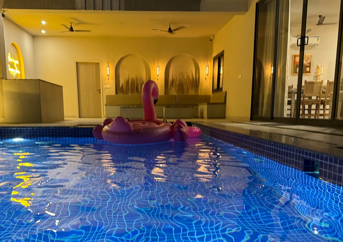 Entra en una villa de 4 camas que irradia encanto bohemio y lujo relajado. Un diseño estilo patio envuelve una piscina deslumbrante. Tres habitaciones eclécticas cuentan con camas tamaño king; una ofrece dos con baño privado. A solo 10 minutos de los vibrantes cafés y bares elegantes de Vaishali Nagar, la villa cuenta con un televisor inteligente de 75", altavoces Bose, bares interiores/exteriores, un salón de 1200 pies cuadrados y una cocina curada. Disfruta de la limpieza las 24 horas, los 7 días de la semana, los servicios opcionales de chef y las entregas zomato&blinkit sin problemas.