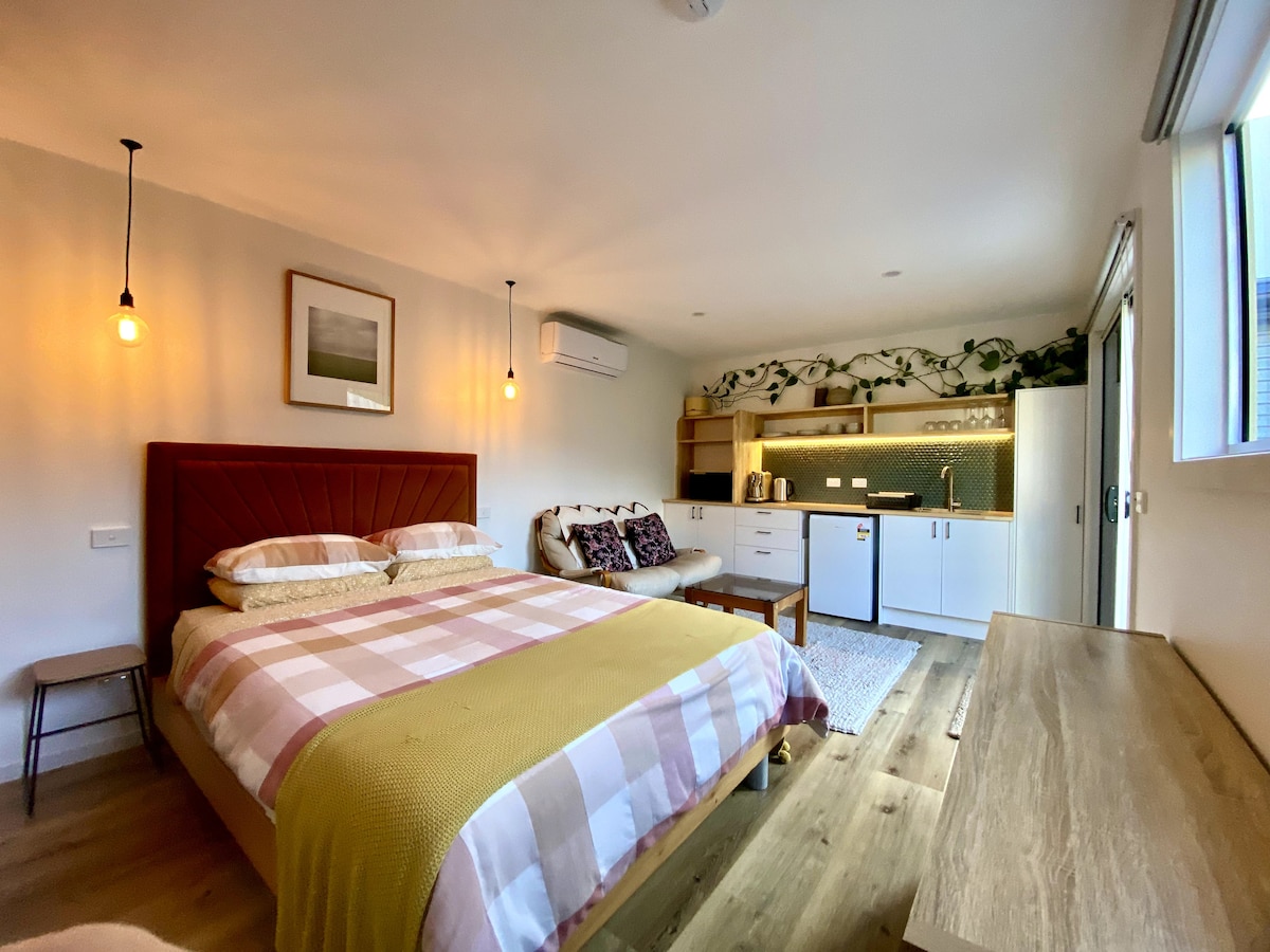 Seeking a quiet place to relax, recharge, breathe deeply? This spacious, self-contained studio, nestled on a peaceful country block is your perfect private retreat. Tranquillity is on the menu with native trees and birds to feast your eyes upon out every window. Concrete bench tops, French oak floor, a peaceful beachy vibe. The perfect base to explore the Great Ocean Road region, enjoy the stunning beaches and inspiring trails, and get amongst nature.