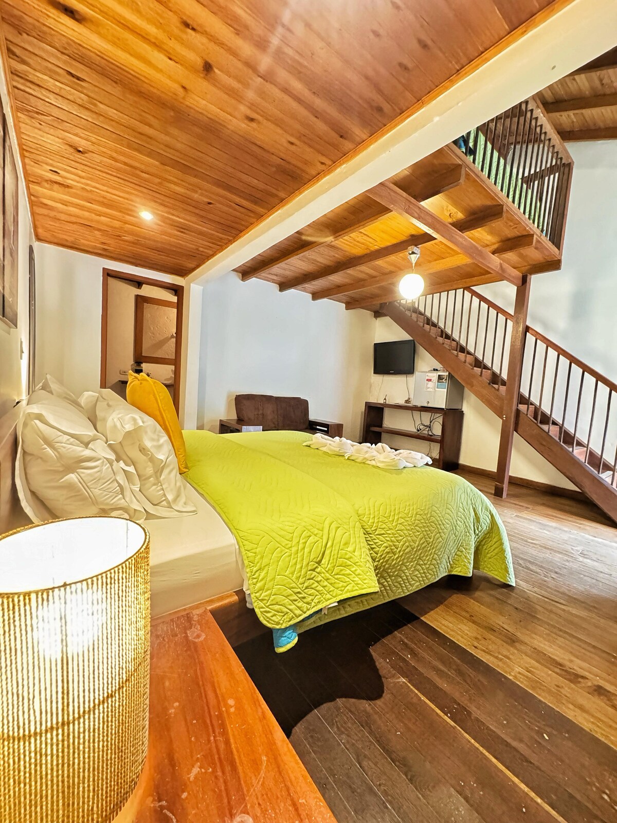 Cómoda y moderna habitación privada, que cuenta con una cama doble, un sofá cama, baño privado, escritorio, 2 mesas de noche, maletero, clóset, caja fuerte. Incluye desayuno tipo bufé, barra libre de café, agua, aromática, y experiencia de preparación de café. Ademas cuenta con acceso a zonas comunes como deck, zonas verdes y salas de estar. Es un espacio campestre rodeado de aves, naturaleza y café. fácil acceso a solo 10 minutos del parque principal.