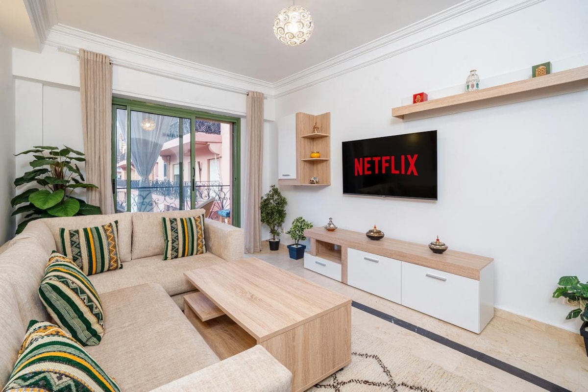✨ Modern 1BR Near Majorelle | Balcony & Wi-Fi Bright and stylish 1-bedroom apartment designed for comfort and a seamless guest experience. Relax in a living room with Moroccan touches, smart lighting, TV, dining area, and a fully equipped kitchen with coffee machine and washer. The bedroom features a TV and ensuite bathroom. Enjoy a private balcony with seating for two. Located in a secure residence in central Guéliz, just minutes from cafés, shops, transport, and Majorelle Garden. 🌴