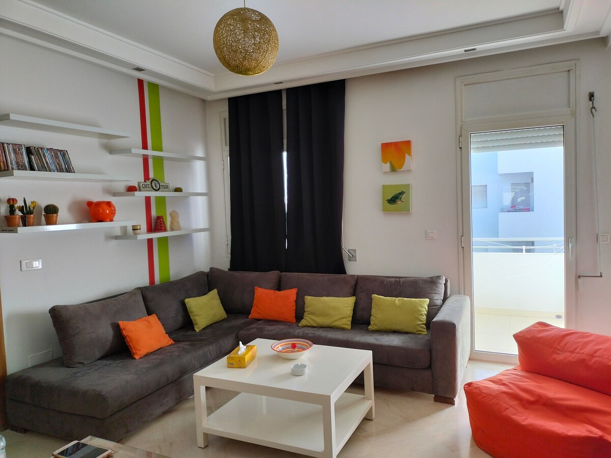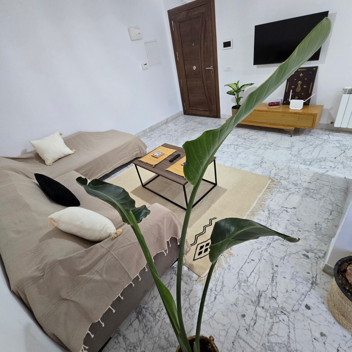 Un interior que celebra la autenticidad y que permite tener un espacio único para vivir Un apartamento decorado con objetos artesanales que cuentan una historia, cada pieza artesanal contribuye a la originalidad de nuestro espacio. Apartamento situado en los Jardines de Cartago a 15 minutos del aeropuerto 5 minutos del lago 2 y del centro comercial Carrefour la Marsa, cerca de todos los servicios, la Marsa, Cartago, la Goulette El apartamento dispone de plaza de aparcamiento en el sótano, fibra óptica, smart TV, una zona de oficina