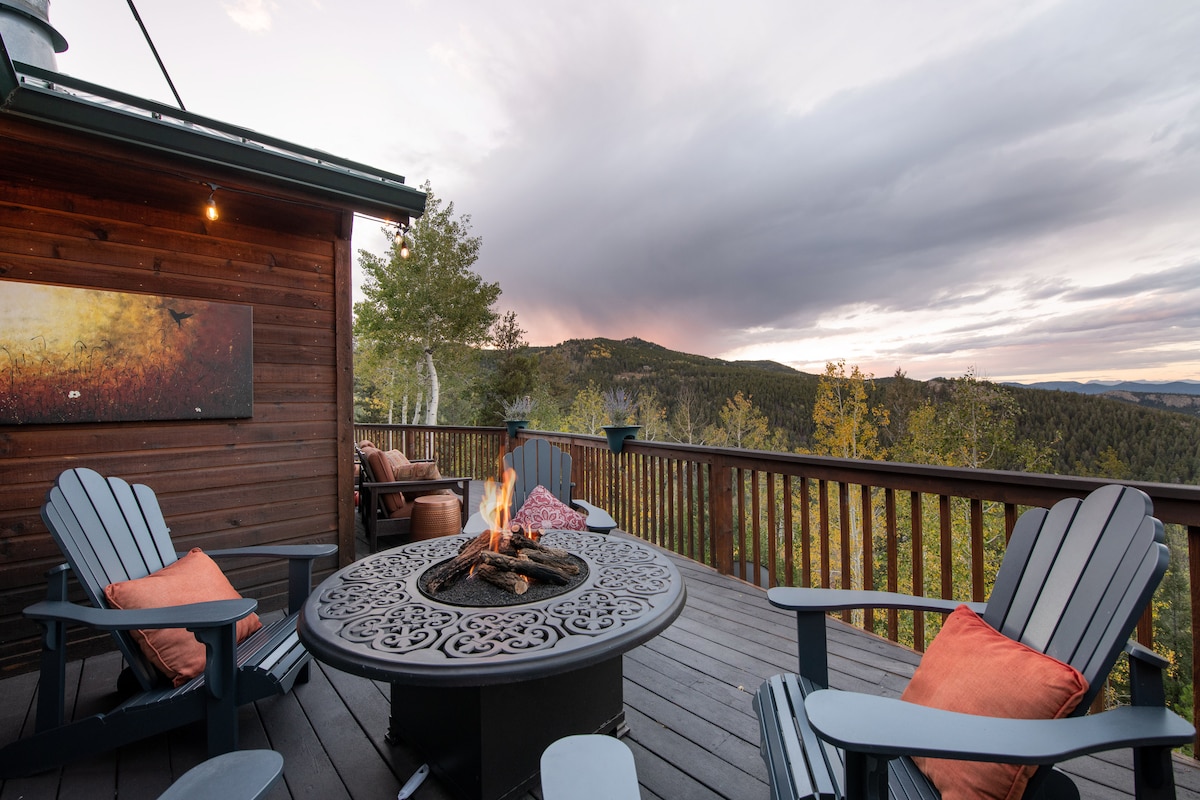 Escápate a un gran refugio privado en la montaña en 9,4 acres encaramado en la cima de la montaña Conifer. Este alojamiento recién renovado ofrece impresionantes vistas sin obstáculos. Disfruta de lujosas comodidades que incluyen jacuzzi, sauna de barril, campo privado de lanzamiento de hachas, chimeneas interiores y exteriores, sala de cine con un televisor gigante de pantalla plana de 85", sala de juegos y bicicleta Peloton+. Perfecto para familias y grupos que buscan una escapada única de primera calidad en Colorado con acceso rápido a Red Rocks, Evergreen, Denver y lugares para bodas.