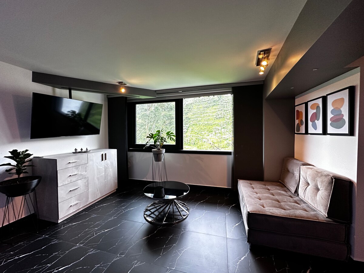 Apartamento moderno con vista a las montañas, ideal para 2 parejas y hasta 6 huéspedes. Cuenta con 2 habitaciones independientes, estudio con escritorio y sofá cama doble, 2 baños, cocina equipada y WiFi rápido. Zona tranquila y segura, a 4 cuadras del parque principal. Parqueadero gratis frente al edificio y café local de cortesía con 4 métodos de preparación. Perfecto para descansar o teletrabajar en Jardín.