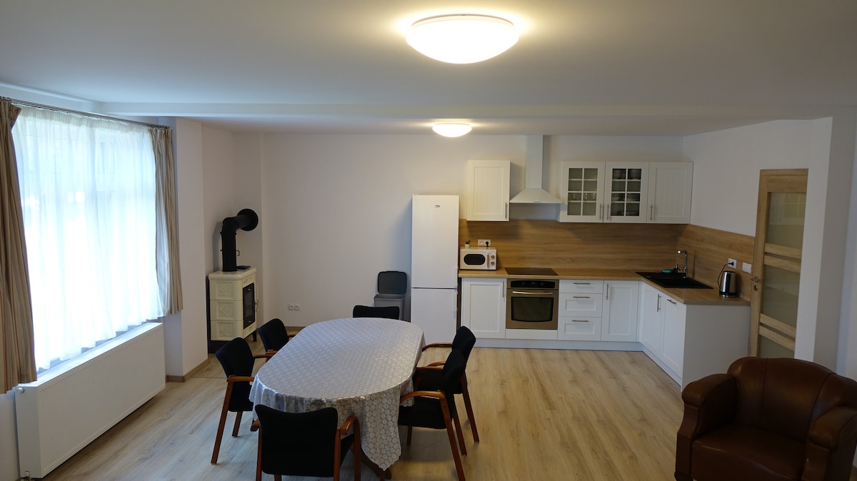 El cómodo apartamento forma parte de un elegante edificio rural de 1844. El interior es luminoso gracias a una gran ventana panorámica con una vista única a la montaña. El ambiente interior se puede hacer especial con el sistema de sonido Hi-Fi. Existe la posibilidad de hacer fuego en una estufa. Se adjunta un hermoso jardín con un pequeño arroyo, chimenea, sala de estar con una caja de arena para niños. El estacionamiento es seguro y cómodo justo al lado de la entrada del departamento.