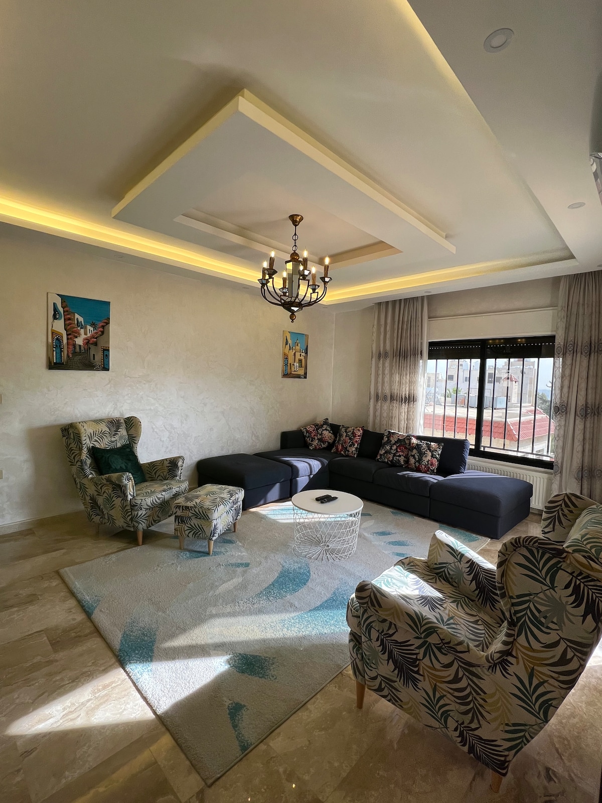 Alójate con estilo en este apartamento contemporáneo RECIÉN amueblado y TOTALMENTE equipado, y disfruta de: > Habitaciones amplias y luminosas. > Vistas privadas y sin obstáculos de la ciudad. >Los mejores restaurantes/cafeterías, tiendas de comestibles y mucho más, todo a poca distancia a pie. > Ubicación dinámica, cerca de todas las carreteras principales de la ciudad. - El centro de la ciudad está a 10 minutos en coche :) Servicios: - Wifi de alta velocidad. - TV inteligente. - Bañera. - Aire acondicionado. - Aparcamiento gratuito Esta es una opción ideal para familias o amigos que buscan disfrutar de una cómoda estancia de cinco estrellas en Amán.