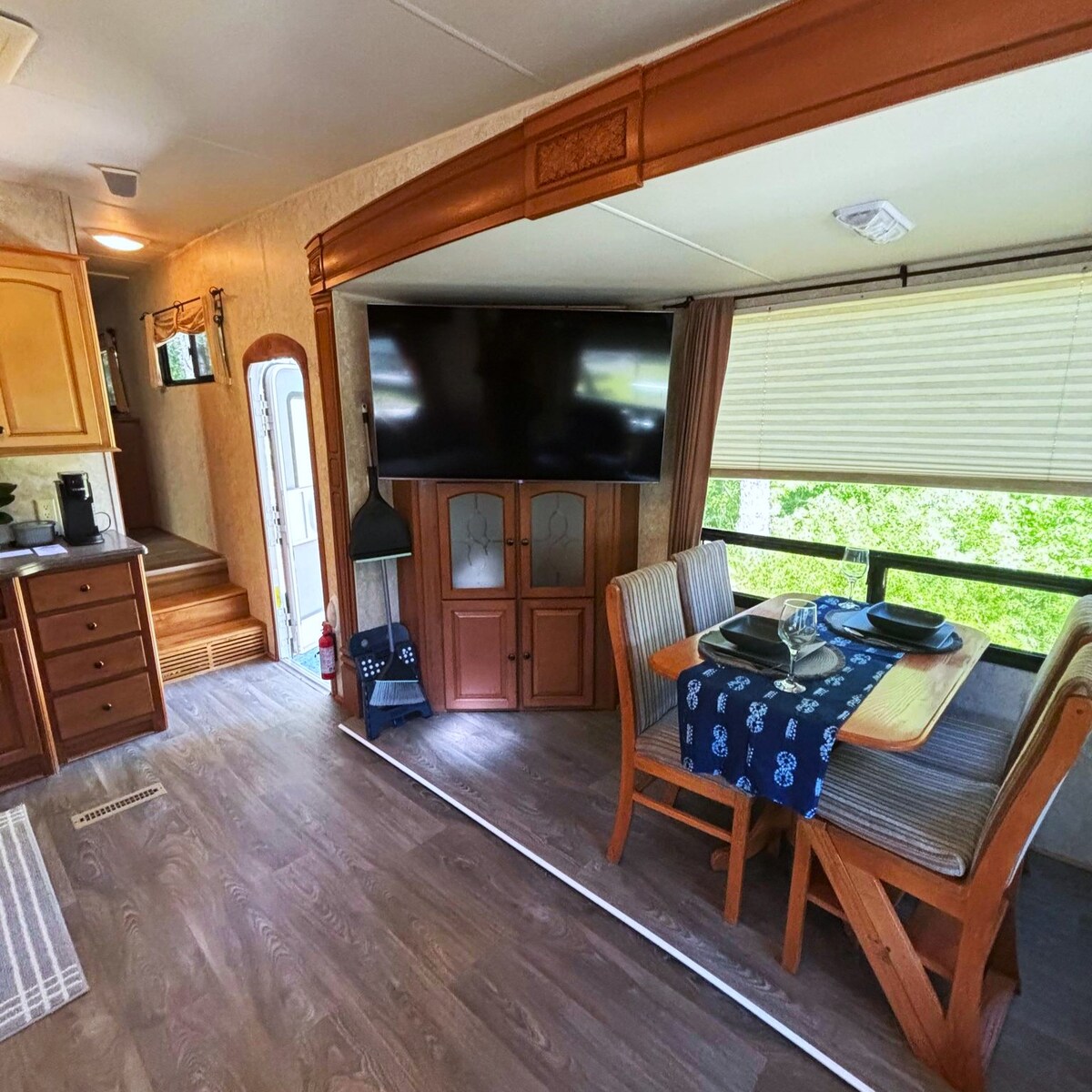 Esta acogedora caravana es amplia, moderna y luminosa. ¡Tiene todo lo que necesitas para sentirte como en casa! Esta caravana puede dormir hasta 4 personas. Tiene un dormitorio principal con una cama tamaño queen y un sofá cama extraíble en el área de estar. Viene con WiFi, 2 televisores Roku, microondas, estufa/horno, tostadora, chimenea y un baño de tamaño completo con mucho espacio de almacenamiento.