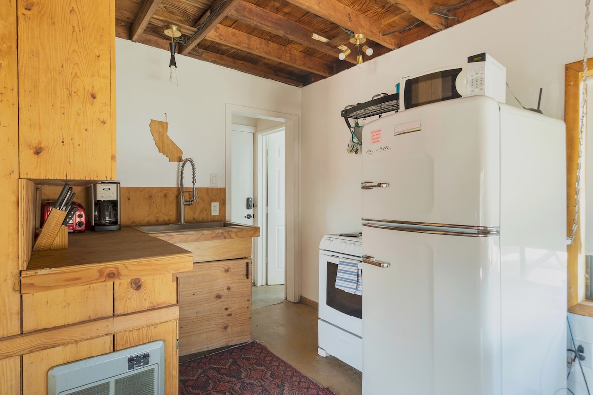 Cabaña original de 1957 Jackrabbit Joshua Tree Homestead. ¡Con jacuzzi! La cabaña es pequeña, de unos 400 pies cuadrados, y tiene unas vistas fantásticas del desierto de Mojave. La habitación individual tiene dos (2) camas de tamaño completo con colchones nuevos Casper y sábanas de algodón orgánico. La pequeña cocina original tiene nevera completa, microondas y estufa. Fogata al aire libre y barbacoa. Wifi de alta velocidad y TV inteligente. La cabaña tiene baño original con ducha, inodoro y lavabo. Maravillosas noches estrelladas. Grandes vibraciones de Joshua Tree.
