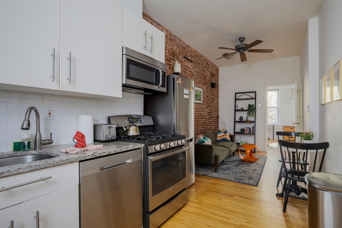 ¡Energía urbana, encanto de piedra rojiza! ¡Le damos la bienvenida a la bulliciosa Journal Square en Jersey City! Renovamos nuestra hermosa casa de piedra rojiza del siglo XIX e instalamos todo nuevo. El espacioso dormitorio principal delantero tiene una cama tamaño queen y una sala de estar; el dormitorio trasero más pequeño tiene una cama de tamaño completo que da a nuestro tranquilo y sereno patio trasero. Como vivimos en la planta baja, estamos encantados de ayudarte a que tu estancia sea lo más agradable posible. Tenemos licencia completa PERMISO N.º: STR-002935-2025