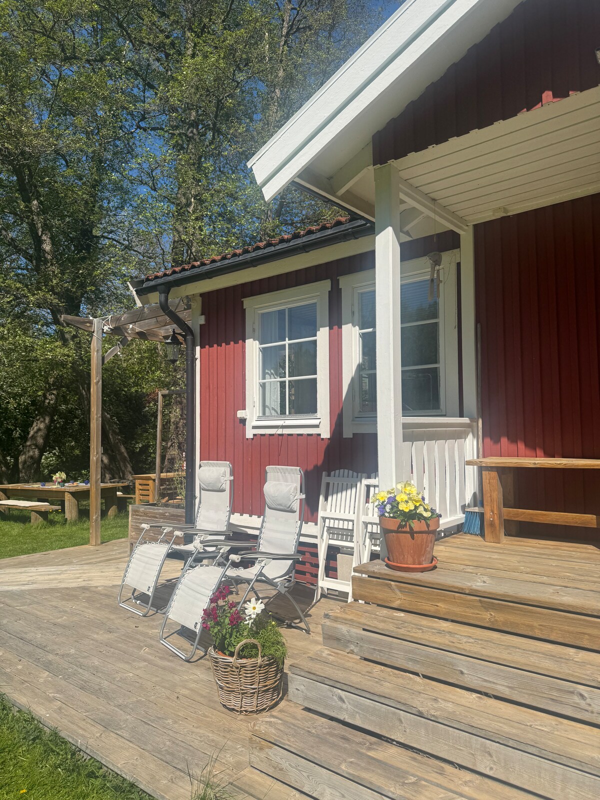 Charming 130-year-old cottage (90 m²) with a modern yet cosy feel. Two renowned spas (Yasuragi & Skepparholmen) within walking distance. Bottom floor: kitchen and dining area with classic wood stove, living room and bathroom. Your own garden and spacious wooden deck—perfect for sunbathing or BBQs. Set in a beautiful area with a crystal-clear lake for bathing just 200 m away, with a nature reserve surrounding it. Sea dock ~700 m. 30 minutes to Stockholm by Waxholm boat, bus or car.