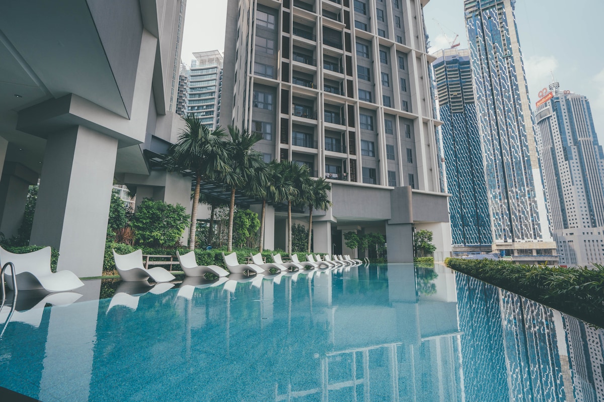 Disfruta de una experiencia de lujo en este céntrico alojamiento: - A 10 minutos a pie de las Torres Petronas. - A 5 minutos en coche de las Torres Petronas KLCC. - A 5 minutos en coche del centro comercial Pavilion. - Cerca del paraíso gastronómico y centro de entretenimiento Bukit Bintang. - Majestuosa vista de KLCC (desde el área de la piscina). Instalaciones: - TV de 55 pulgadas con acceso a Netflix. - Piscina infinita con vistas a las Torres Petronas, la Torre KL y el horizonte nocturno. - Jacuzzi y salón en la piscina. - Acceso al gimnasio. - Conexión wifi rápida. - Agua caliente - Aire acondicionado.