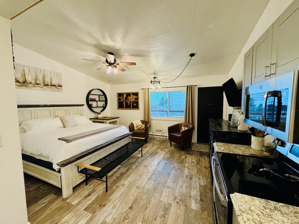 Seafarer Suites is conveniently located with Ocean views in the picturesque Historical Art and Food District of Homer. Our Studios non-ocean view are for those that plan on eating on the go and are primarily looking for a king-sized comfortable bed. This open floor studio plan provides private bathroom, flat screen TV, Microwave, Coffee Maker, Ice Maker and Coin Laundry are available on premises.