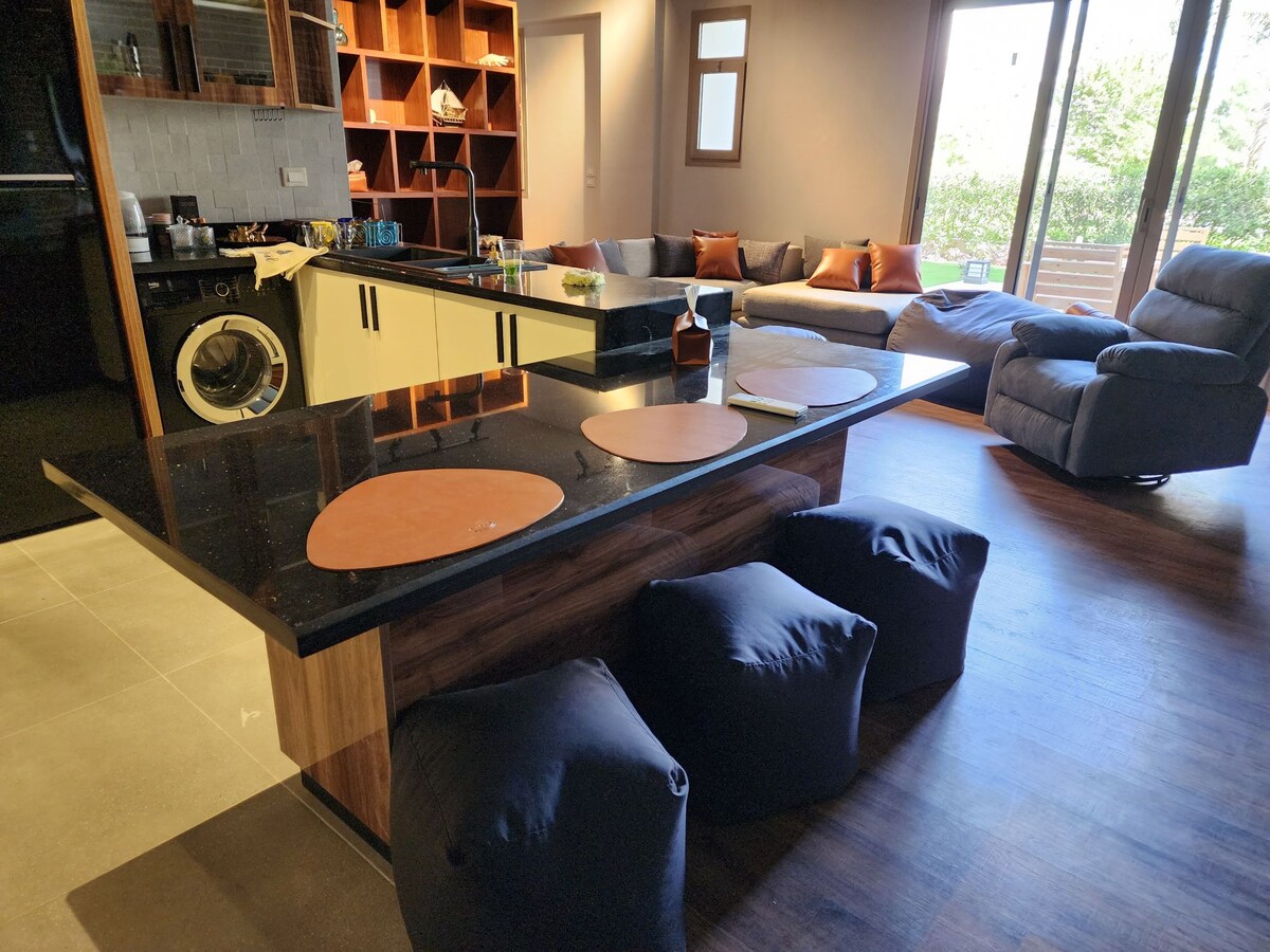 Furniture Recently Upgraded Escape to a stylish, private 3-bedroom villa perfect for families and groups. This sunlit sanctuary features a private garden, and a fully equipped kitchen. Enjoy a 75” Smart TV, Cinema System with smart tv light and playstation with high-speed Wi-Fi, and smart home features. Located just minutes from Dream Park and Arkan Plaza, this home comfortably accommodates your group for a memorable retreat of comfort, privacy, and fun.