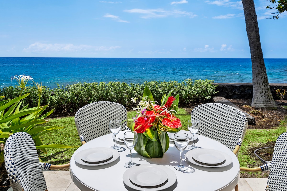 Apartamento de lujo, espacioso y recién reformado, justo en el océano, en un complejo boutique cerrado. Increíbles vistas desde el lanai y la sala de estar. Unidad de esquina en la planta superior con ventanas por todas partes para que te sientas como si estuvieras viviendo fuera. Cama tamaño king y sofá cama tamaño queen con colchón de espuma viscoelástica para un máximo de 4 huéspedes. Piscina frente al mar con barbacoa comunitaria. Tranquilo; alejado de Ali'i Drive. Cerca de todo, a solo una milla del centro de Kona. Plaza de aparcamiento reservada. Aire acondicionado.