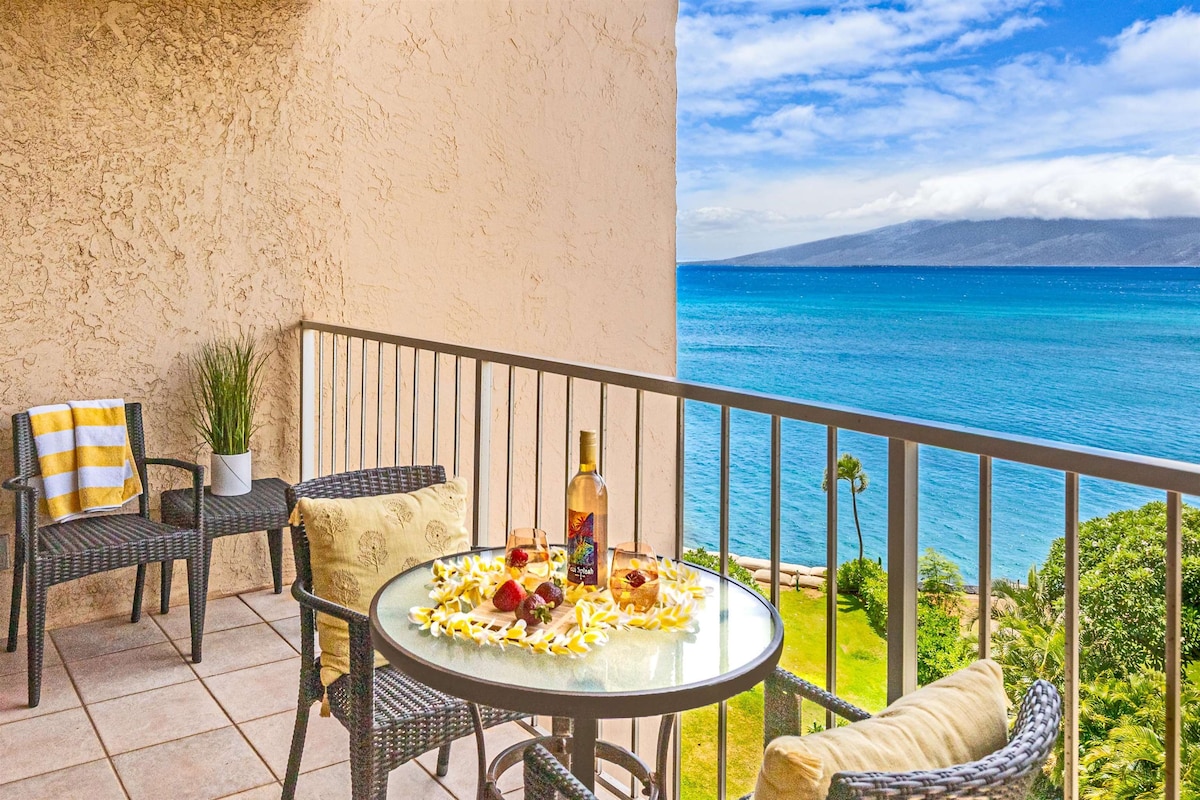 *Available for booking! Thankfully, our condo is not located in the wildfire affected area* Enjoy breathtaking panoramic views in this remodeled oceanfront corner condo located on Kahana Beach! With floor-to-ceiling windows in both the living and bedroom, gentle breezes and sunsets can be enjoyed lounging on the couch or relaxing in bed. Imagine falling asleep to the lull of ocean waves at your feet and waking to spouting whales in the background. Truly an oasis on the Valley Isle.