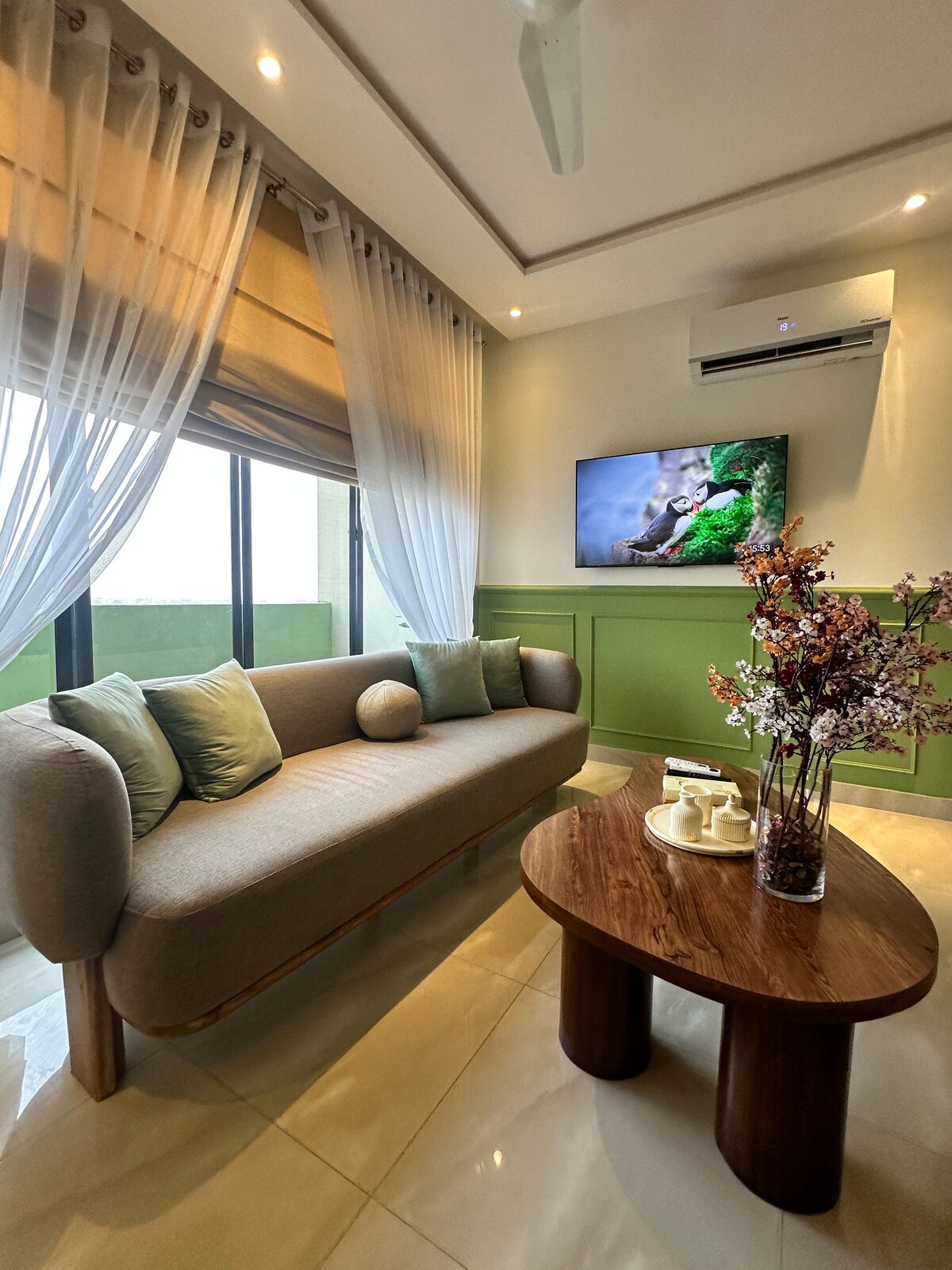 Este apartamento acogedor y bien cuidado se encuentra en el corazón de Gulberg, una de las zonas más céntricas y seguras de la ciudad. Ideal tanto para estancias cortas como largas, el espacio está cuidadosamente diseñado para ofrecer comodidad y conveniencia. En el salón hay instalado un televisor de 65 pulgadas para que te relajes. También hay un comedor de 1,77 m para satisfacer tus necesidades de hambre. Un gran SOFÁ de BOUCLE para ofrecerte las sensaciones prémium que te mereces.