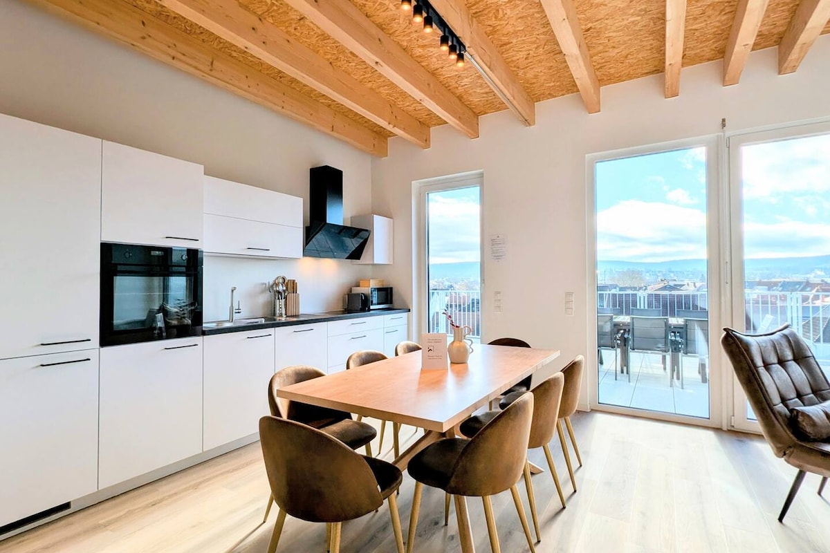 Stylish apartment with balcony and open views over Kaiserslautern. Ideal for business travelers, couples or small groups. 2 separate bedrooms with king/queen beds, 65” Smart TV with streaming, high-speed WiFi and workspace. Fully equipped kitchen with coffee & tea station, washer-dryer and a calm atmosphere. Central location near main station, city center, restaurants and easy access to Ramstein Air Base. Registration number: NV-2023-420