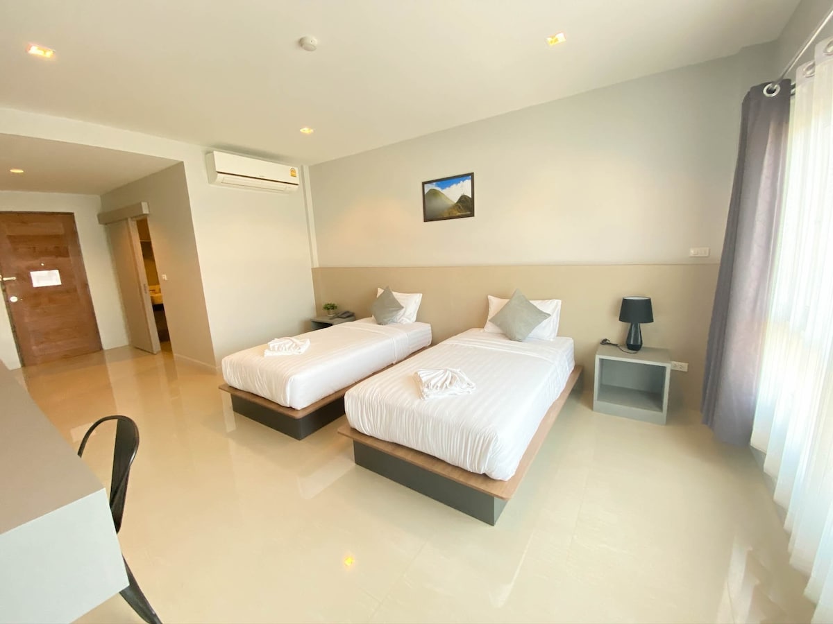 🌿Escápate a un escondite sereno en el corazón de Ban Tai, Kanchanaburi. Nuestro hotel ofrece habitaciones limpias y elegantes situadas sobre una acogedora cafetería y una relajante tienda de masajes tailandeses, que ofrecen todo lo que necesitas para una estadía rejuvenecedora. 🛏️Tu habitación privada - Espacio luminoso y climatizado con cómoda cama tamaño queen o individual. - Baño privado con ducha caliente y servicios básicos - Grandes ventanas o balcón con vistas al jardín o a la calle. - Wifi de alta velocidad, televisor inteligente y un pequeño escritorio apto para trabajar.