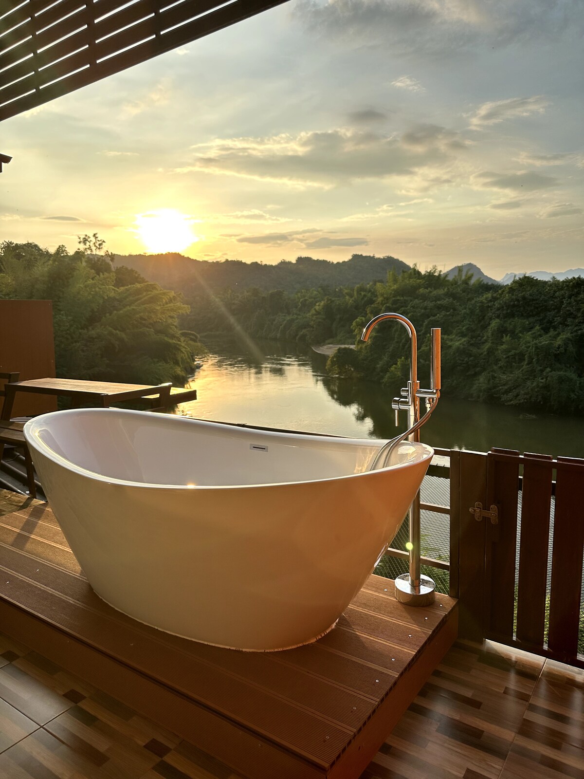 Deluxe con bañera exterior, red de cuerda y vista al río